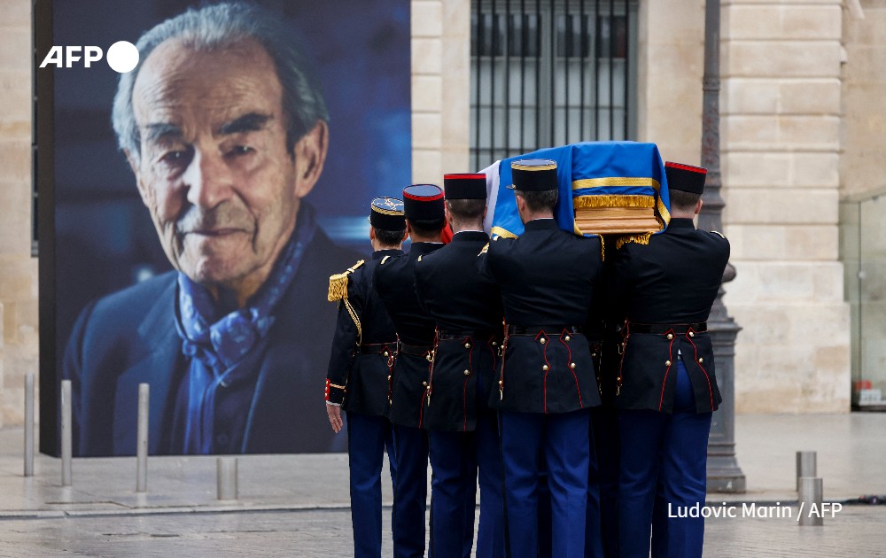 Republican Guards carry the coffin of former French justice minister Robert Badinter during a national tribute ceremony in his honour outside the Ministry of Justice, at the Place Vendome, in Paris on February 14, 2024. Badinter, who died on February 9, 2024, at the age of 95, saved many lives by dedicating his own to the fight against capital punishment, playing a pivotal role in banning the guillotine in 1981.