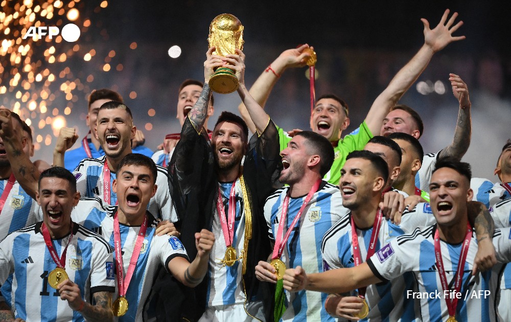 Argentina's forward #10 Lionel Messi lifts the World Cup trophy during the Qatar 2022 World Cup trophy ceremony after the football final match between Argentina and France at Lusail Stadium in Lusail, north of Doha on December 18, 2022. Argentina won in the penalty shoot-out.