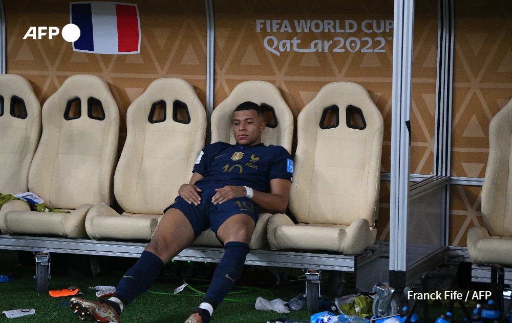 France's forward #10 Kylian Mbappe reacts after losing in the penalty shoot-out of the Qatar 2022 World Cup football final match between Argentina and France at Lusail Stadium in Lusail, north of Doha on December 18, 2022.
