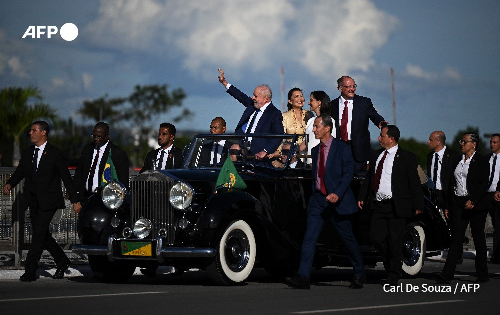 Brazil's new President Luiz Inacio Lula da Silva (L) waves at supporters as he arrives with his wife First Lady Rosangela 'Janja' da Silva (2-L), new Vice-President Geraldo Alckmin (R) and his wife Maria Lucia Ribeiro Alckmin at Planalto Palace after their inauguration ceremony at the National Congress, in Brasilia, on January 1, 2023. Lula da Silva, a 77-year-old leftist who already served as president of Brazil from 2003 to 2010, takes office for the third time with a grand inauguration in Brasilia.