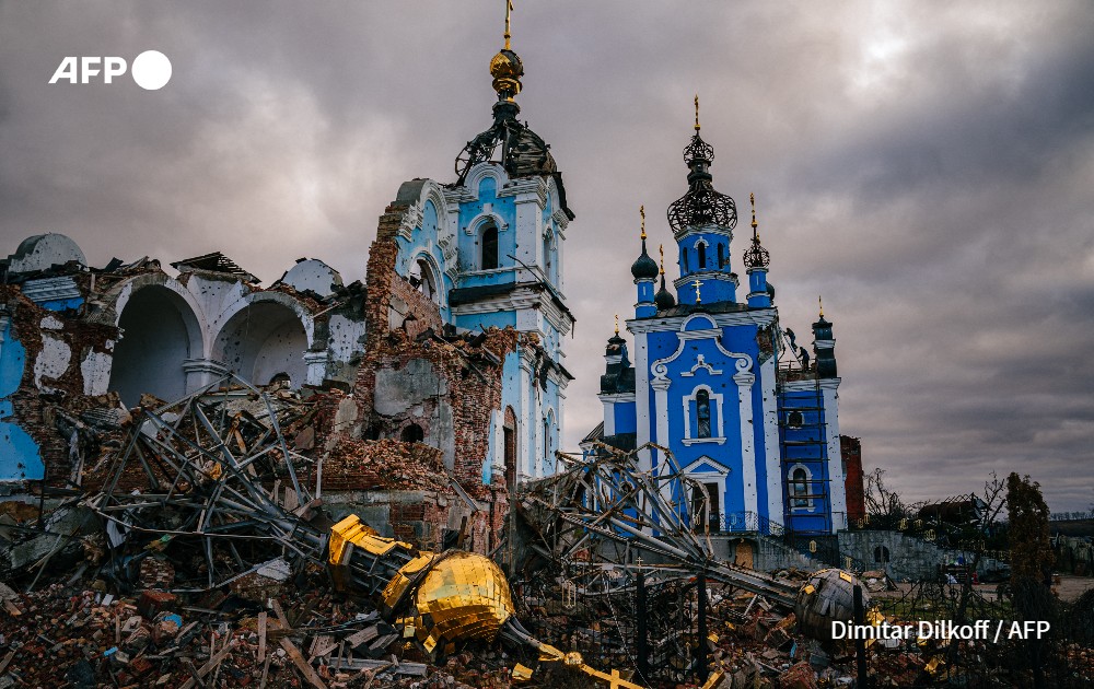 Construction workers climb onto the roof of a destroyed church in the village of Bohorodychne, Donetsk region on January 4, 2023, amid the Russian invasion of Ukraine. Bohorodychne is a village in Donetsk region that came under heavy attack by Russian forces in June 2022, during the Russian invasion of Ukraine. On August 17, 2022 the Russian forces captured the village. The Armed Forces of Ukraine announced on September 12, 2022 that they took back the control over the village. A few resident came back to restore their destroyed houses and live in the village.