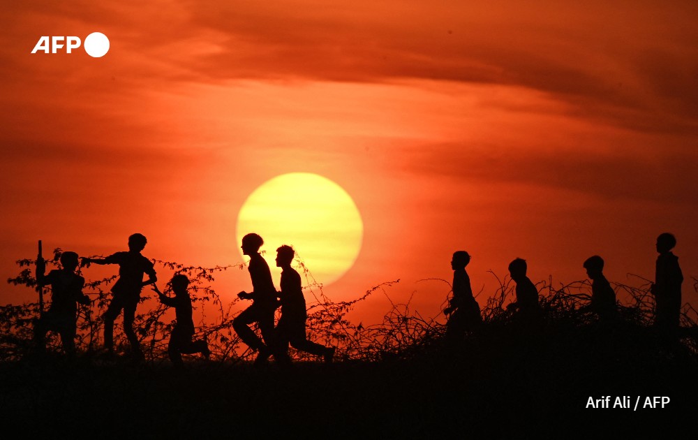Children are silhouetted as they play against the backdrop of the last sunset of 2022, in Lahore on December 31, 2022.