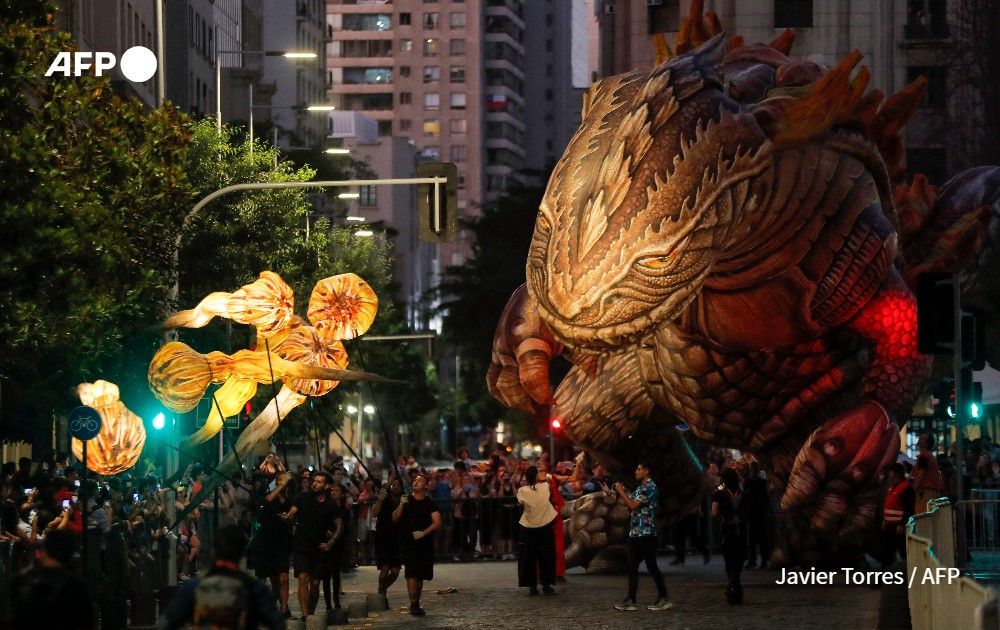 The inflatable dinosaur known as "Saurian" is seen during "Saurian and the Witnesses of Outer Space" -the night parade of the French Plasticiens Volants company- on the inaugural day of the "Teatro a Mil" international festival, in front of La Moneda Presidential Palace in Santiago on January 3, 2023.