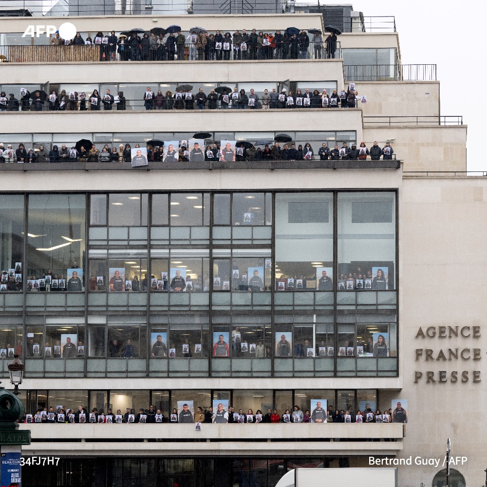Au Siège de l’AFP à Paris et dans de très nombreux bureaux à travers le monde, les journalistes de l’AFP ont symboliquement brandi les portraits de leurs neufs collègues gazaouis, lors de cette initiative organisée par la direction de l’Agence en coordination avec les syndicats et la Société des journalistes.