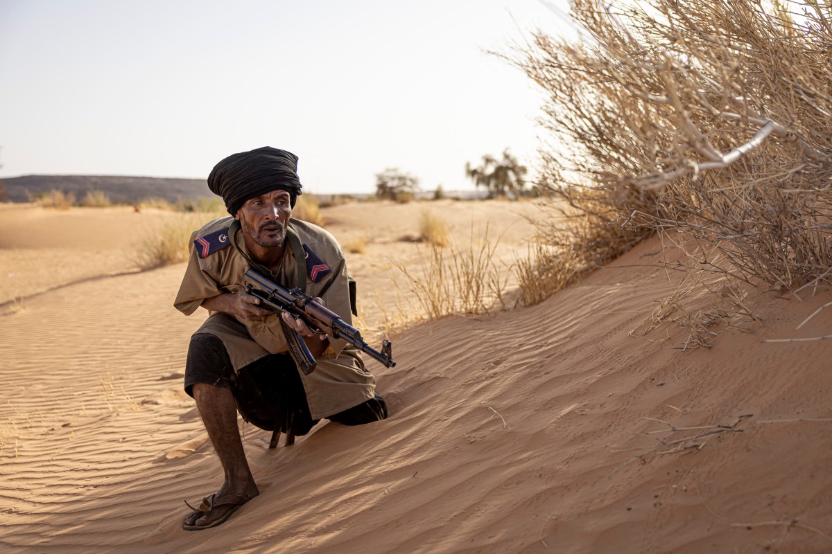 • 1re photo : Un membre de l’unité de la Garde nationale méhariste en position lors d’un exercice d’entraînement dans la région du Hodh Ech Chargui, le 7 avril 2025. © Patrick Meinhardt / AFP