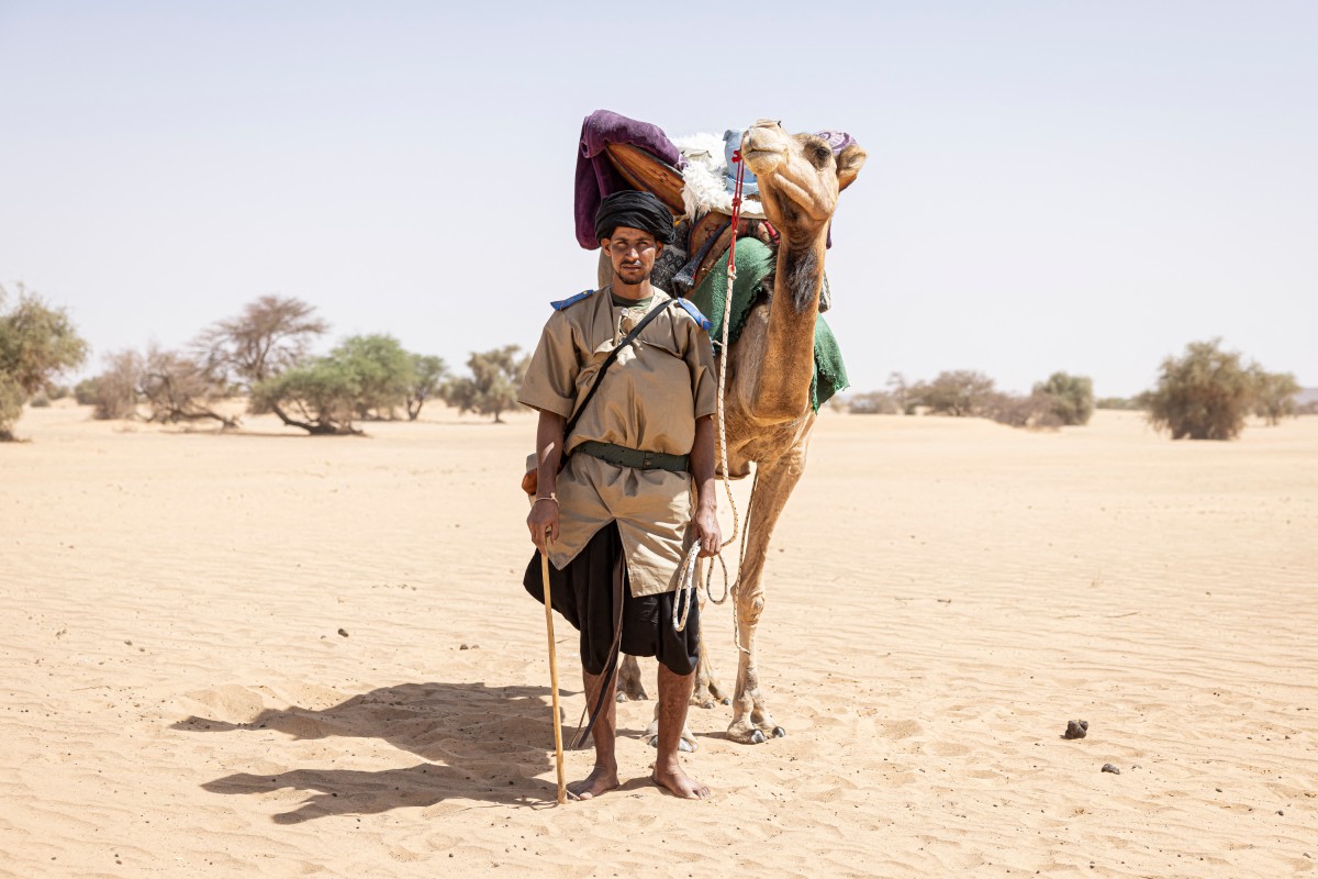 • 3e photo : Sidi, membre de l’unité de la Garde nationale méhariste, pose à côté de son chameau dans la région du Hodh Ech Chargui, le 7 avril 2025. © Patrick Meinhardt / AFP