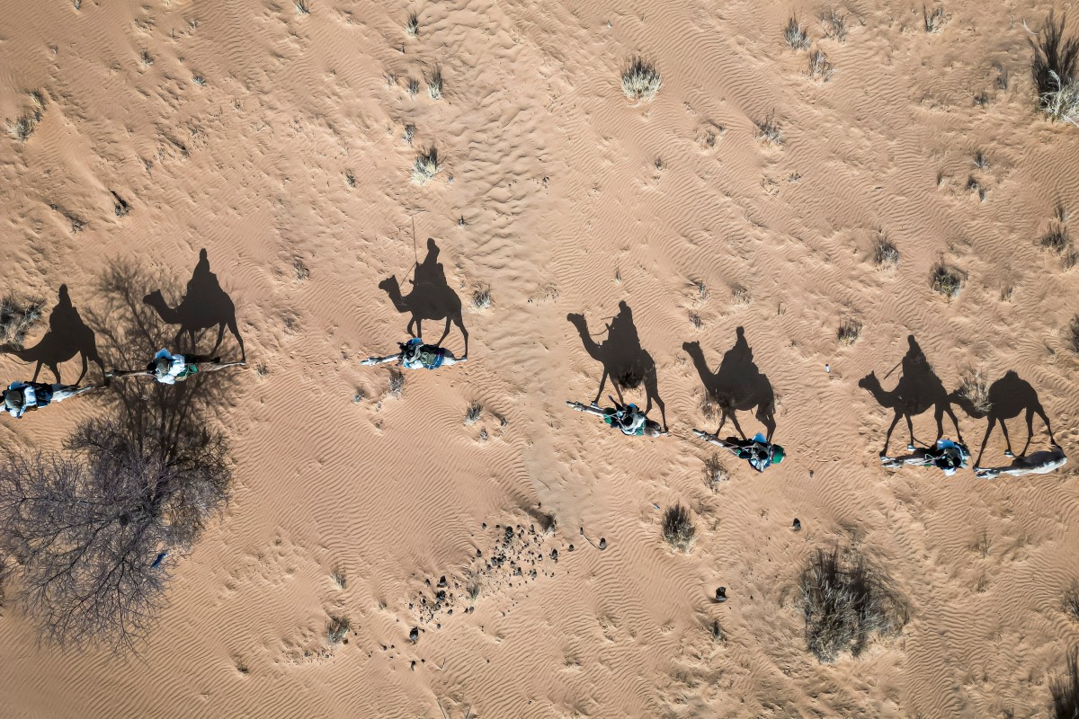 « Cette photo prise par drone a été réalisée lors d'une patrouille avec des membres de l'unité de Garde nationale méhariste dans la région de Hodh Ech Chargui, en avril 2025. Nous les avions rencontrés la veille et avions passé la nuit dans leur camp avant de partir en patrouille tôt le matin. Nous avions emporté le drone avec nous car nous voulions montrer l'immensité de la zone qu'ils patrouillent. Il était tôt et le soleil n'avait pas fini de se lever, créant des ombres allongées des soldats montant leurs chameaux. À ce moment-là, deux unités allaient dans des directions opposées, créant ces jolis motifs. Je trouvais que les ombres illustraient bien cette idée d'une garde furtive patrouillant dans le désert, toujours en alerte. »