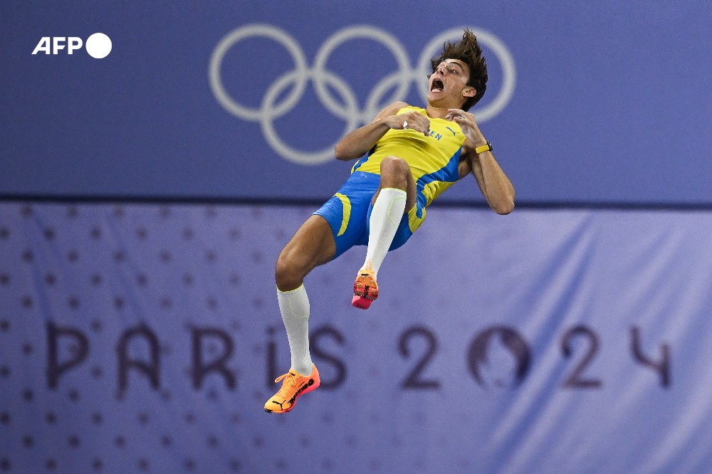 O sueco Armand Duplantis após atingir novo recorde mundial de salto com vara (6,25 m), no Stade de France em 5 de agosto de 2024. © Ben Stansall / AFP