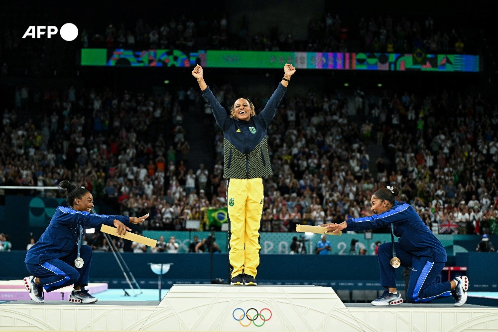 A americana Simone Biles (esquerda) e sua compatriota Jordan Chiles (direita) curvam-se em sinal de respeito diante de Rebeca Andrade, ouro no solo nos Jogos Olímpicos de Paris. © Gabriel Bouys / AFP