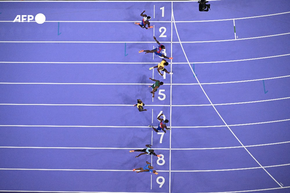 A vitória por pouco de Noah Lyles nos 100m nos Jogos Olímpicos de Paris 2024, no Stade de France. © Jewel Samad / AFP