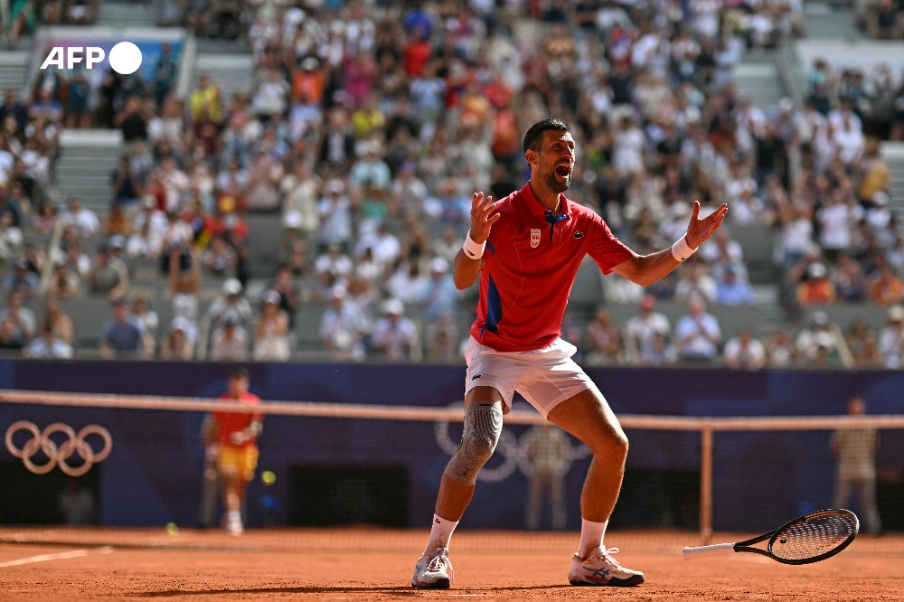 O sérvio Novak Djokovic reage após vencer a final olímpica contra o espanhol Carlos Alcaraz, em Roland Garros. © Patricia de Melo Moreira / AFP